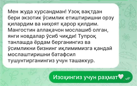 Ҳозироқ эксклюзив мангостин кўчатларини харид қилинг ва уйингизда тропик жаннатни яратинг!