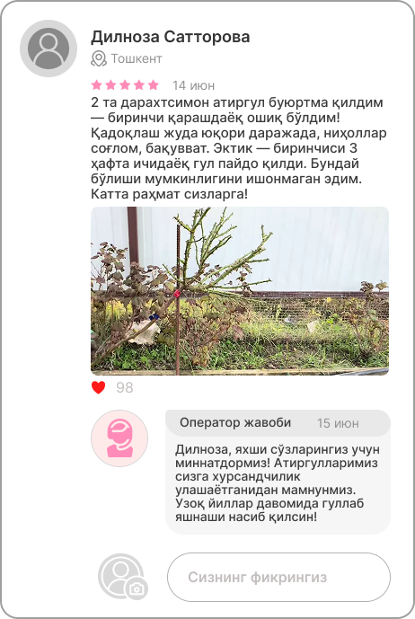 Дарахтсимон атиргул ниҳолларига буюртма бериш учун ариза қолдиринг — операторларимиз сиз билан тез орада боғланиб, расмийлаштиришда ёрдам беришади!